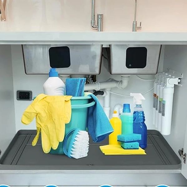 I love an under the sink mats. You can get these in all sizes, colors, and different materials. I think rubber mats are the best option but every sink is different. So some might work better as durable felt mats instead of rubber ones. But spills are a breeze to clean up if they are rubber.