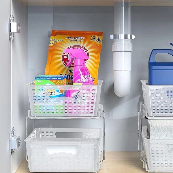 I personally keep gloves, sponges, clean towels, small trash bags, every day cleaning supplies in mine. I have two, one on either side under the kitchen sink. I put tall cleaning items on top and the small compact items on the bottom. They have so many options with colors, design and finishes that you can never get bored shopping. These have dividers too. I got extras for my cat food to keep it organized in the pantry.